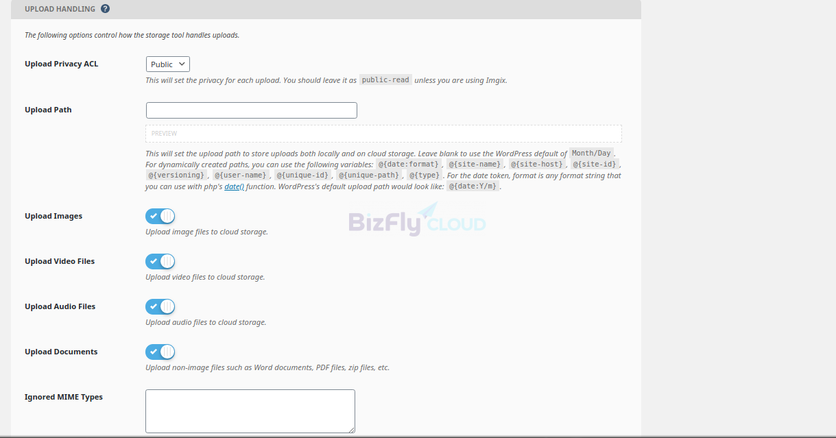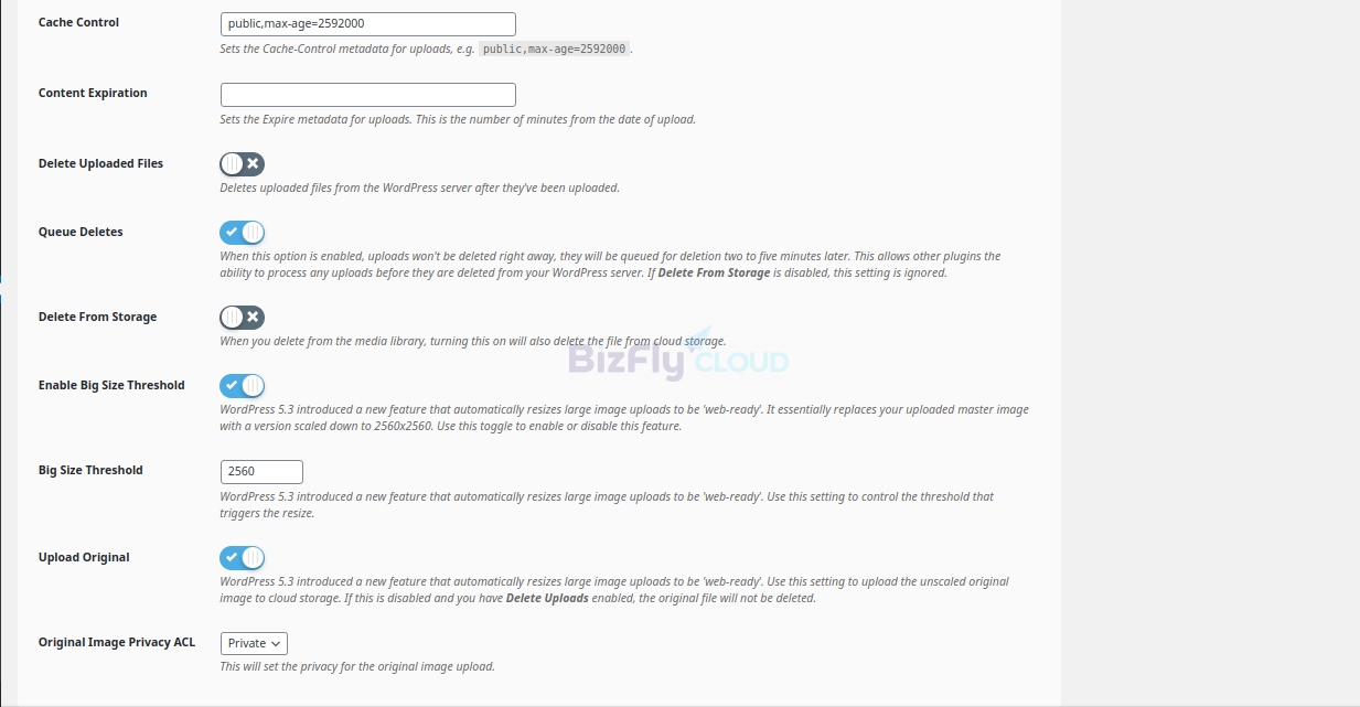 Tùy chọn upload: Một số tùy chọn upload Upload Privacy ACL: public-read Upload Path: Đường dẫn lưu trữ file upload ở cả local và trên cloud storage. Để trống để sử dụng đường dẫn mặc định : Tháng/ Ngày Delete Uploaded Files: Xóa file đã được upload khỏi WordPress Server Queue Deletes: Khi tùy chọn này được bật, file uploads sẽ không bị xóa ngay lập tức, chúng sẽ được xếp hàng để xóa từ hai đến năm phút sau. Điều này cho phép các plugin khác có khả năng xử lý bất kỳ tải lên nào trước khi chúng bị xóa khỏi máy chủ WordPress của bạn. Nếu Queue Deletes bị tắt, cài đặt này sẽ bị bỏ qua. Delete From Storage: Khi tính năng này bật, khi xóa file ở media library thì file trên Cloud Storage cũng bị xóa theo. Ví dụ: