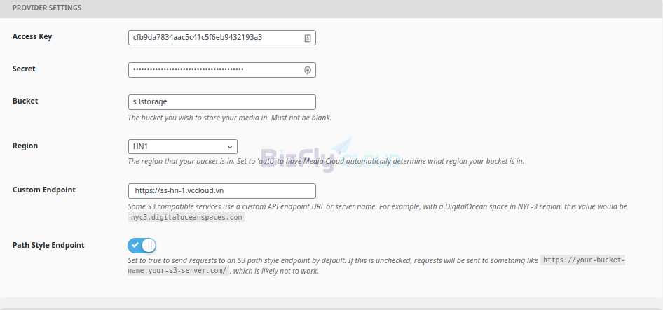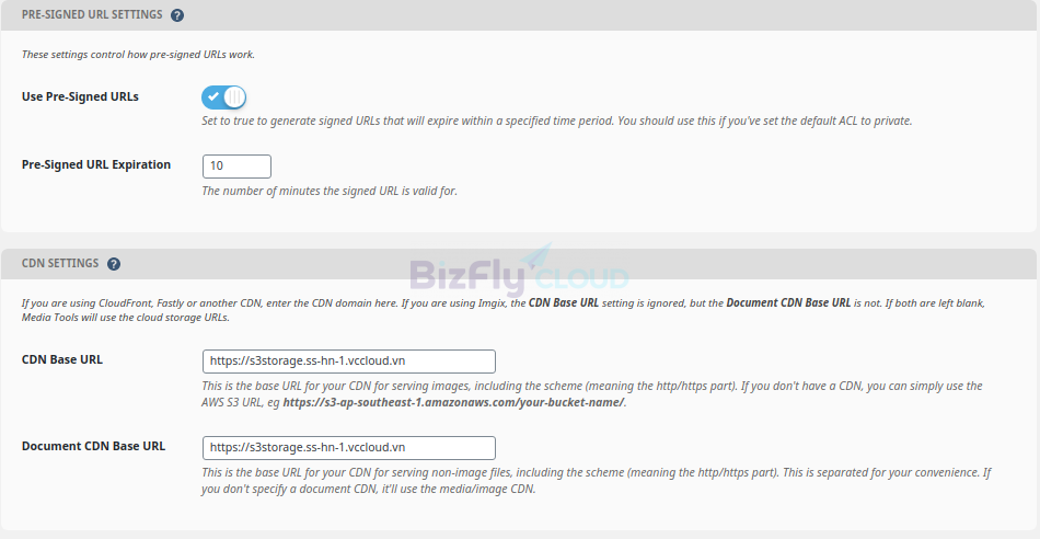 CDN Settings Nếu bạn có sử dụng một dịch vụ CDN như CDN của Bizfly Cloud, bạn có thể cấu hình thêm Endpoint của CDN tại đây. Nếu không, bạn có thể để đuờng dẫn đến bucker trên Simple Storage.