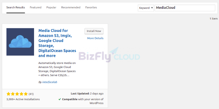 Tại ô search, bạn nhập MediaCloud, nhấn tìm kiếm và chọn Install Now và chờ cho quá trình cài đặt hoàn tất.