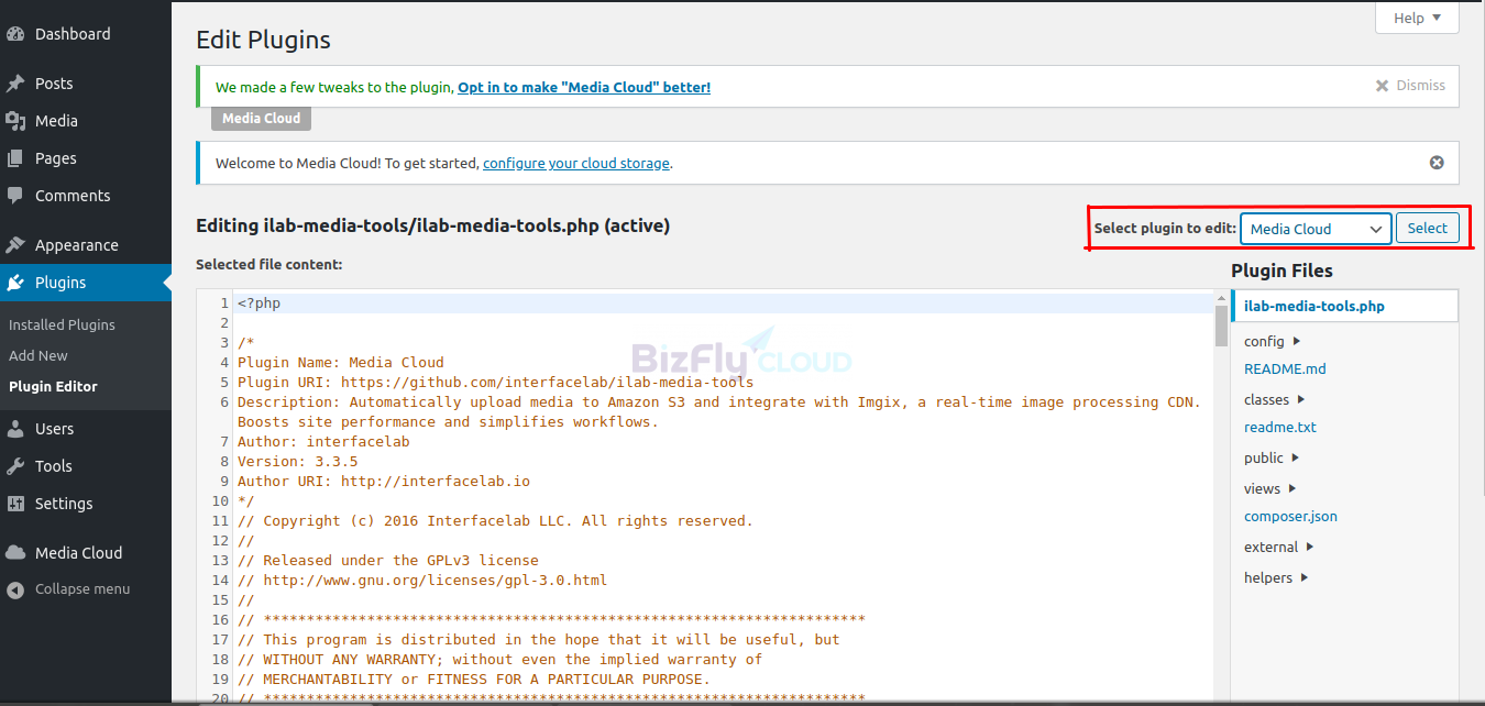 Tại góc phải, bạn chọn đến Media Cloud và nhấn Select.