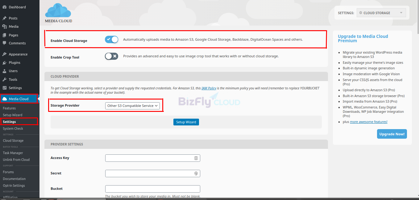 Tại góc trái, bạn chuyển tới MediaCloud > Settings. Click chọn “Enable Cloud Storage” Sau đó chọn nhà cung cấp dịch vụ lưu trữ “Storage Provider” là “Other S3 Compatible Service”