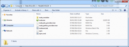 Here we can observe node.exe and npm.cmd files and also “node_modules” folder. Now onwards, we will refer the following names for easier discussion purpose NODSJS_HOME= D:\NodeJS.V.0.12.0 NODEJS_MODULES= D:\NodeJS.V.0.12.0\node_modules NODEJS_NPM= D:\NodeJS.V.0.12.0\node_modules\npm NOTE: